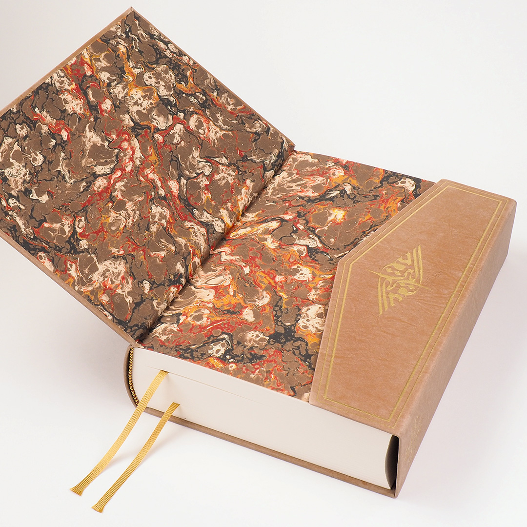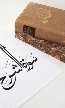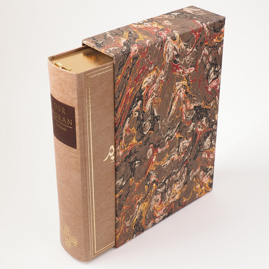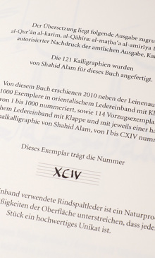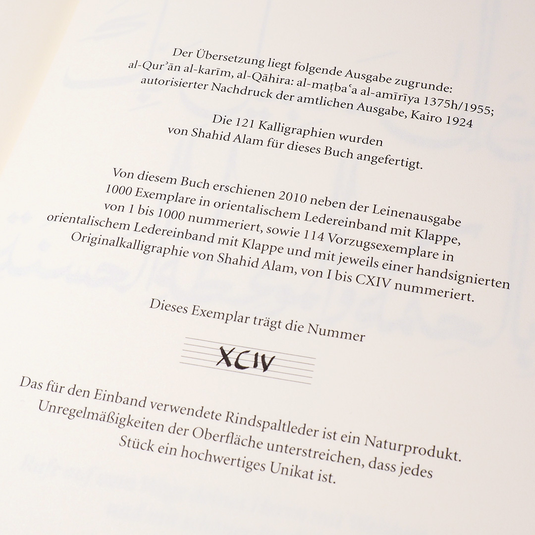 Von dieser Vorzugsausgabe im Schmuckschuber mit je einer Originalkalligraphie von Shalid Alam von I bis CXIV nummeriert erscheinen 114 Exemplare. Jeder Nummer liegt das signierte Original der Suren-Überschrift mit gleicher Nummer bei.