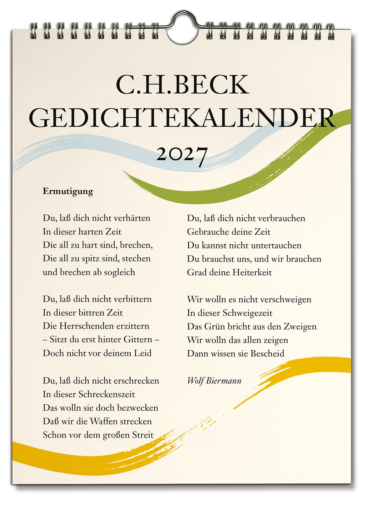 Der 43. Jahrgang des C.H.Beck Gedichtekalenders (dessen früherer Titel «Kleiner Bruder» immer noch bekannt ist) sieht ähnlich aus wie die vorigen Jahrgänge und ist auch nach dem gleichen Konzept gemacht: Er enthält 24 Gedichte aus der deutschen Literatur vom Mittelalter bis heute.